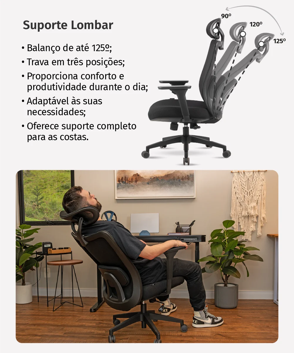Cadeira muito bonita, bastante confortável e estável. Pontos a considerar são o encosto de cabeça fixo, o que pode incomodar pessoas mais altas que 1,85m e o encosto da lombar rígido que incomoda bastante, difícil de acostumar. Fora isso a cadeira é surpreendente.