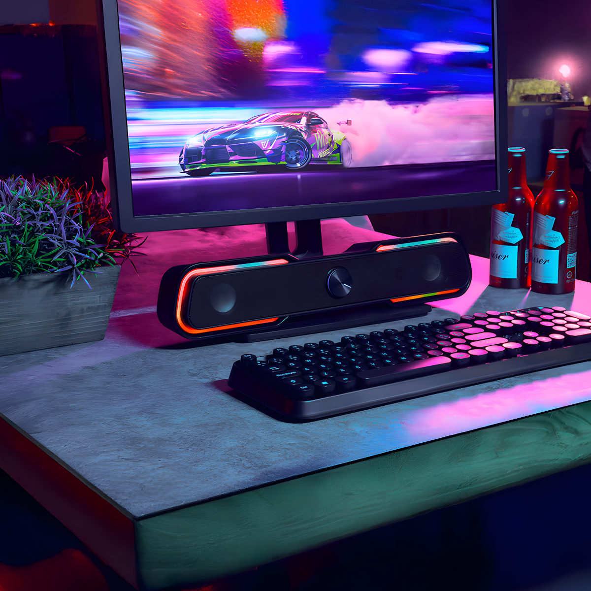 Seu design compacto e elegante, com iluminação RGB, adiciona um toque de estilo ao ambiente, tornando-a perfeita tanto para setups de trabalho quanto para estações gamer. A alimentação é feita diretamente via conexão USB, dispensando o uso de fontes externas e garantindo praticidade e economia de energia.