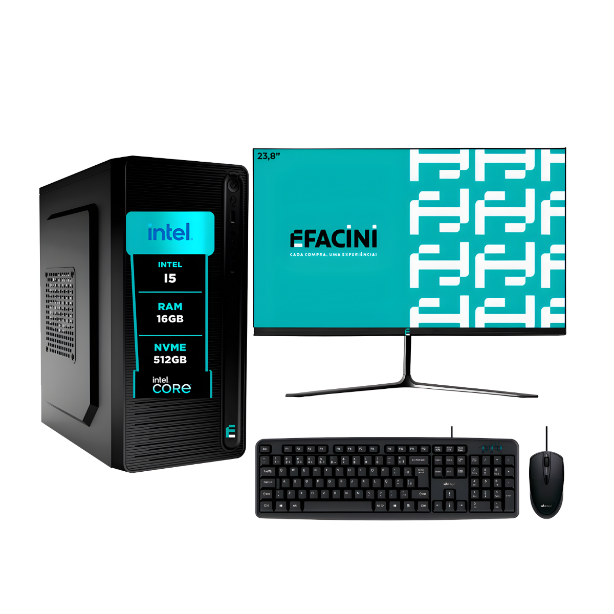 O Computador PC Completo eFacini Intel Core i5 com 16GB de RAM e SSD NVMe de 512GB é a escolha ideal para quem busca desempenho, praticidade e confiabilidade em um único kit. Acompanha monitor LED de 24 polegadas, teclado e mouse inclusos, pronto para uso desde o primeiro dia.