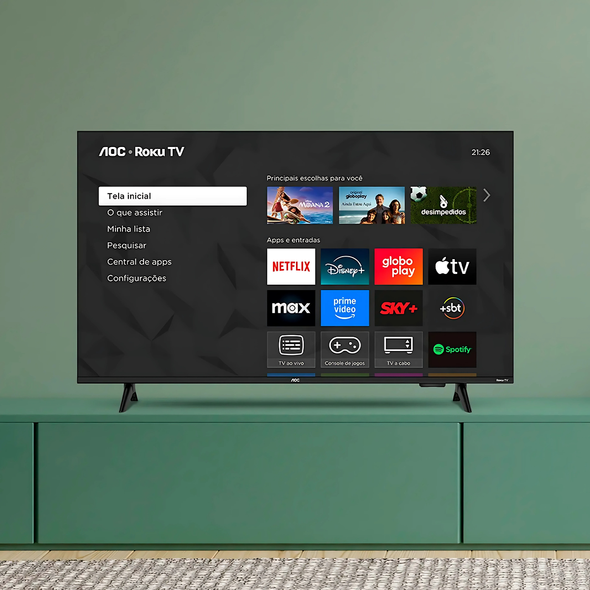 Smart TV AOC 32″ Roku TV oferece praticidade, qualidade de imagem e entretenimento ilimitado em um só equipamento. Com resolução HD, processador Quad-Core e sistema Roku integrado, você acessa seus aplicativos de streaming favoritos como Netflix, Prime Video, Globoplay, Disney+ e muito mais, de forma rápida e intuitiva.