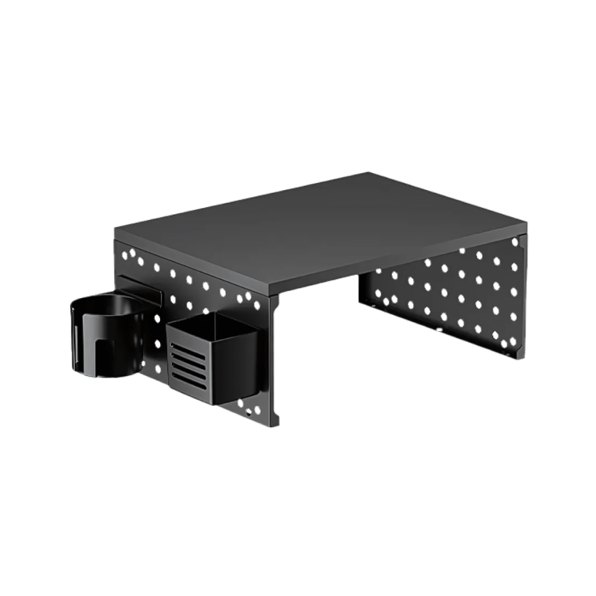 Sua estrutura combina MDF, aço e plástico, garantindo resistência e durabilidade, enquanto os dois porta-objetos laterais embutidos e o espaço sob a plataforma oferecem versatilidade para armazenar acessórios, livros e materiais essenciais. O design discreto em preto fosco se adapta a qualquer ambiente de trabalho ou estudo.